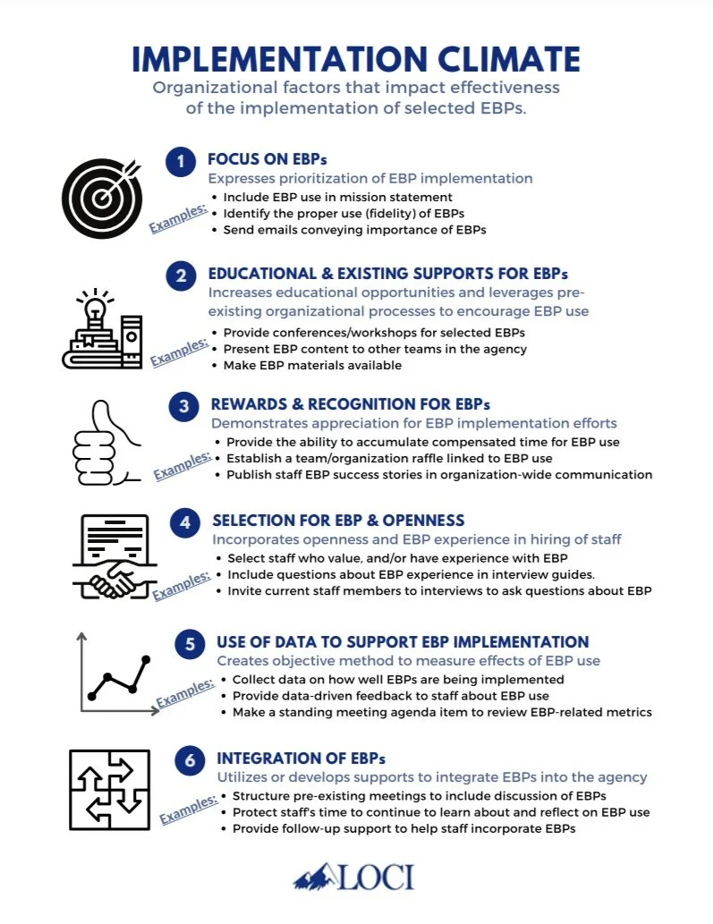 Aarons, G.A., Ehrhart, M.G., Farahnak, L.R., Sklar, M. (2014). Aligning leadership across systems and organizations to develop a strategic climate for evidence-based practice implementation. Annual Review of Public Health, 35, 255-274.